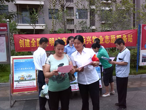 為全力配合贛州市創建全國文明城市活動,燕興物業在管轄小區內向廣大業主開展了宣傳活動,在宣傳欄內張貼了遵德守禮提示牌,在小區主大門前懸掛了宣傳文明條幅,成立了志愿服務隊,設立了“志愿服務站”。